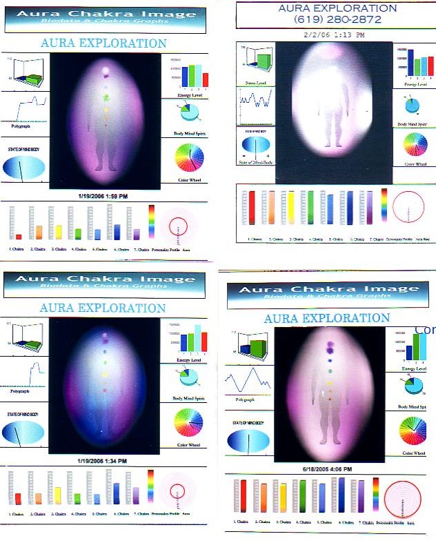 L’immagine in alto a destra è l’aura di un nuovo “Angelo Umano”. L’Aura è colma di luce bianca e i chakra sono calibrati ed attivi al cento percento (vedere i blocchi colorati sotto l’immagine). Questo è un essere energeticamente potente. Anch’io ho lavorato con le immagini dell’Aura, ma non ho mai visto un’aura come questa prima. Questo è un essere asceso, un Angelo Umano! Sheila dice che ne vede uno o due ogni mese!